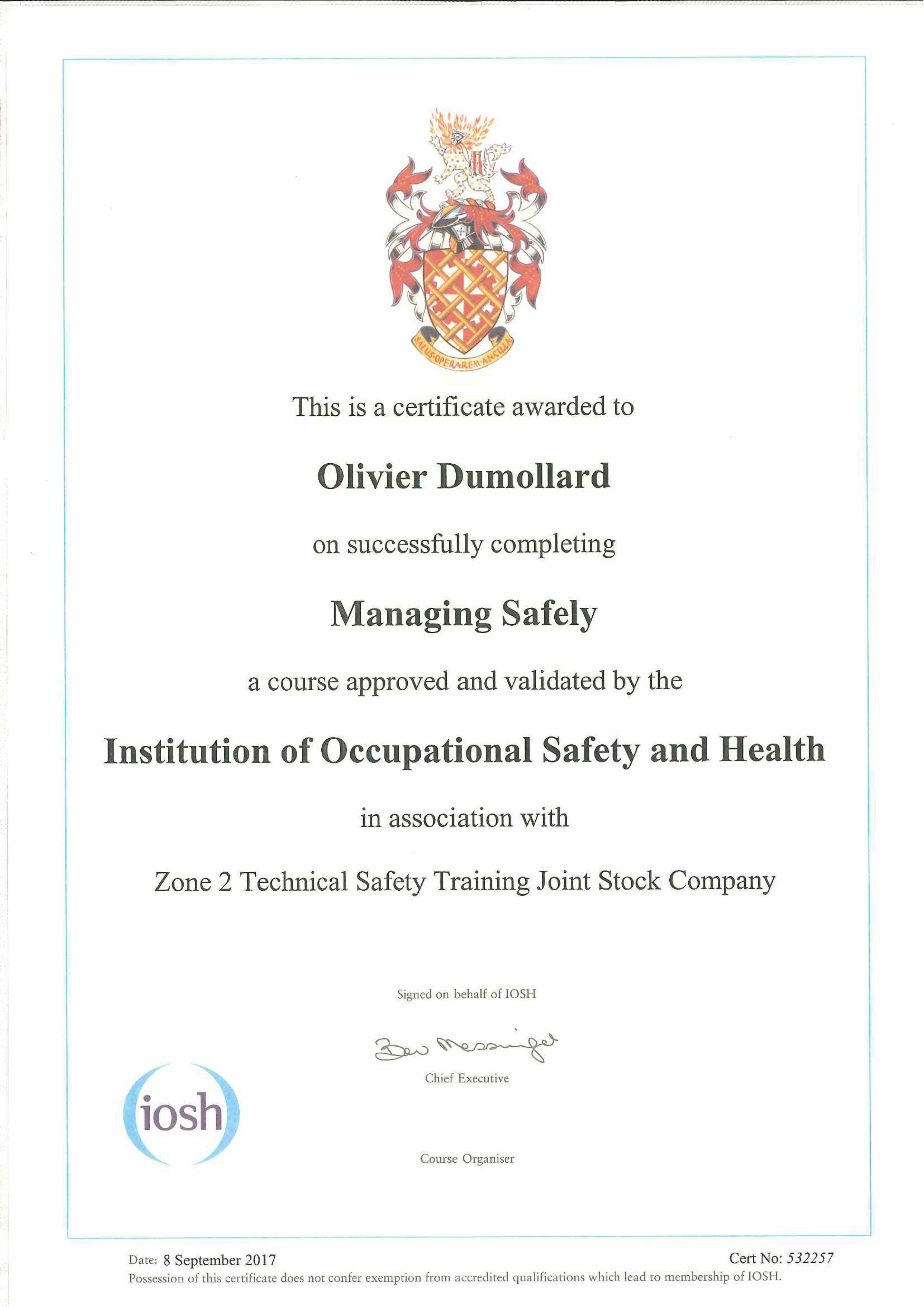 Học viên hoàn thành cả hai bài đánh giá với số điểm tối thiểu 70% sẽ nhận được chứng chỉ Managing Safely do IOSH (Institute of Occupational Safety and Health, UK) cấp.